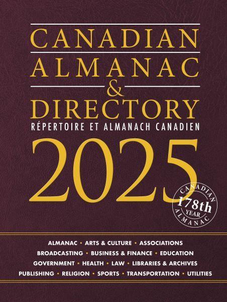 The Canadian Almanac & Directory is the most complete source of Canadian information available - cultural, professional and financial institutions, legislative, governmental, judicial and educational organizations. Canada's authoritative sourcebook for over 170 years, the Canadian Almanac & Directory gives you access to almost 100,000 names and addresses of contacts throughout the network of Canadian institutions.