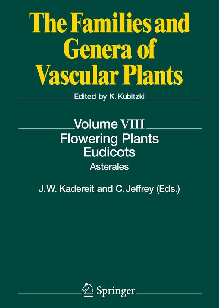 Asterales: Introduction and Conspectus. - Alseuosmiaceae. - Argophyllaceae. - Calyceraceae. - Campanulaceae. - Carpodetaceae. - Compositae: Introduction with Key to the Tribes. - I. Barnadesieae. - II. Mutisieae. - III. Cardueae. - Carduoid Genera of Uncertain Placement. - IV. Gymnarrheneae. - V. Moquinieae. - VI. Vernonieae. - VII. Liabeae. - VIII. Cichorieae. - IX. Gundelieae. - X. Arctotideae. - XI. Corymbieae. - XII. Senecioneae. - XIII. Calenduleae. - XIV. Gnaphalieae. - XV. Astereae. - XVI. Anthemideae. - XVII. Inuleae . -Key to the Tribes of the Heliantheae Alliance. - XVIII. Athroismeae. - XIX. Helenieae. -XX. Coreopsideae. - XXI. Neurolaeneae. - XXII. Tribe Tageteae. - XXIII. Tribe Chaenactideae. - XXIV. Tribe Bahieae. - XXV. Polymnieae. - XXVI. Heliantheae. - XXVII. Millerieae. - XXVIII. Madieae. - XXIX. Perityleae. - XXX. Eupatorieae. - Asteroid Genus of Uncertain Placement. - Selected Bibliography to Compositae. Goodeniaceae. - Menyanthaceae. - Pentaphragmataceae. - Phellinaceae. - Rousseaceae. - Stylidiaceae. - Index of Scientific Names.