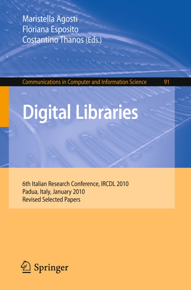 Keynote Addresses. - Digital Cultural Content: National and European Projects and Strategies. - Archival Information Systems in Italy and the National Archival Portal. - System Interoperability and Data Integration. - Making Digital Library Content Interoperable. - Integrating a Content-Based Recommender System into Digital Libraries for Cultural Heritage. - Infrastructures, Metadata Creation and Management. - Digital Stacks: Turning a Current Prototype into an Operational Service. - A First National Italian Register for Digital Resources for Both Cultural and Scientific Communities (Communication). - FAST and NESTOR: How to Exploit Annotation Hierarchies. - A New Domain Independent Keyphrase Extraction System. - An Event-Centric Provenance Model for Digital Libraries. - A Digital Library Effort to Support the Building of Grammatical Resources for Italian Dialects. - Representation, Indexing and Retrieval in Digital Libraries. - Interactive Visual Representations of Complex Information Structures. - Mathematical Symbol Indexing for Digital Libraries. - Using Explicit Word Co-occurrences to Improve Term-Based Text Retrieval. - Semantic Relatedness Approach for Named Entity Disambiguation. - Merging Structural and Taxonomic Similarity for Text Retrieval Using Relational Descriptions. - Handling Audio-Visual and Non-traditional Objects. - Audio Objects Access: Tools for the Preservation of the Cultural Heritage. - Toward Conversation Retrieval. - Improving Classification and Retrieval of Illuminated Manuscript with Semantic Information. - Content-Based Cover Song Identification in Music Digital Libraries. - Toward an Audio Digital Library 2. 0: Smash, a Social Music Archive of SHellac Phonographic Discs.