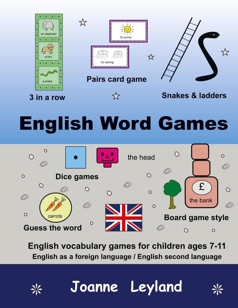 At the front of the book is a dice with the numbers in English on it and this can be photocopied and made to use with the games. The fun games are printed in colour and include snakes & ladders and other games in the style of a board game, dice games, guess the word game, pairs card game and 3 in a row. The author, Joanne Leyland, is a qualified foreign languages teacher with 20 years experience in teaching languages to children. The suggested age range for this book is children aged 7-11 but the content may also interest children of other ages who are learning English as a foreign language. Learning a new foreign language at an early age can be an enjoyable and useful experience. Let's make learning English fun!