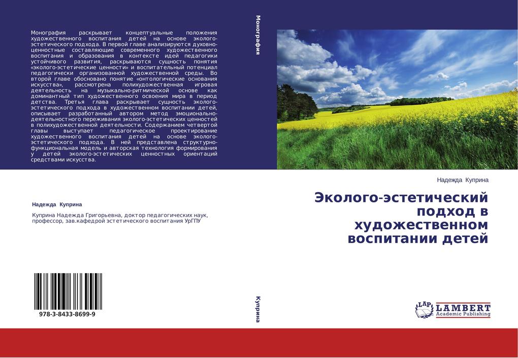 Monografiya raskryvaet konceptual'nye polozheniya hudozhestvennogo vospitaniya detej na osnove jekologo-jesteticheskogo podhoda. V pervoj glave analizirujutsya duhovno-cennostnye sostavlyajushhie sovremennogo hudozhestvennogo vospitaniya i obrazovaniya v kontexte idej pedagogiki ustojchivogo razvitiya, raskryvajutsya sushhnost' ponyatiya "jekologo-jesteticheskie cennosti" i vospitatel'nyj potencial pedagogicheski organizovannoj hudozhestvennoj sredy. Vo vtoroj glave obosnovano ponyatie "ontologicheskie osnovaniya iskusstva", rassmotrena polihudozhestvennaya igrovaya deyatel'nost' na muzykal'no-ritmicheskoj osnove kak dominantnyj tip hudozhestvennogo osvoeniya mira v period detstva. Tret'ya glava raskryvaet sushhnost' jekologo-jesteticheskogo podhoda v hudozhestvennom vospitanii detej, opisyvaet razrabotannyj avtorom metod jemocional'no-deyatel'nostnogo perezhivaniya jekologo-jesteticheskih cennostej v polihudozhestvennoj deyatel'nosti. Soderzhaniem chetvertoj glavy vystupaet pedagogicheskoe proektirovanie hudozhestvennogo vospitaniya detej na osnove jekologo-jesteticheskogo podhoda. V nej predstavlena strukturno-funkcional'naya model' i avtorskaya tehnologiya formirovaniya u detej jekologo-jesteticheskih cennostnyh orientacij sredstvami iskusstva.