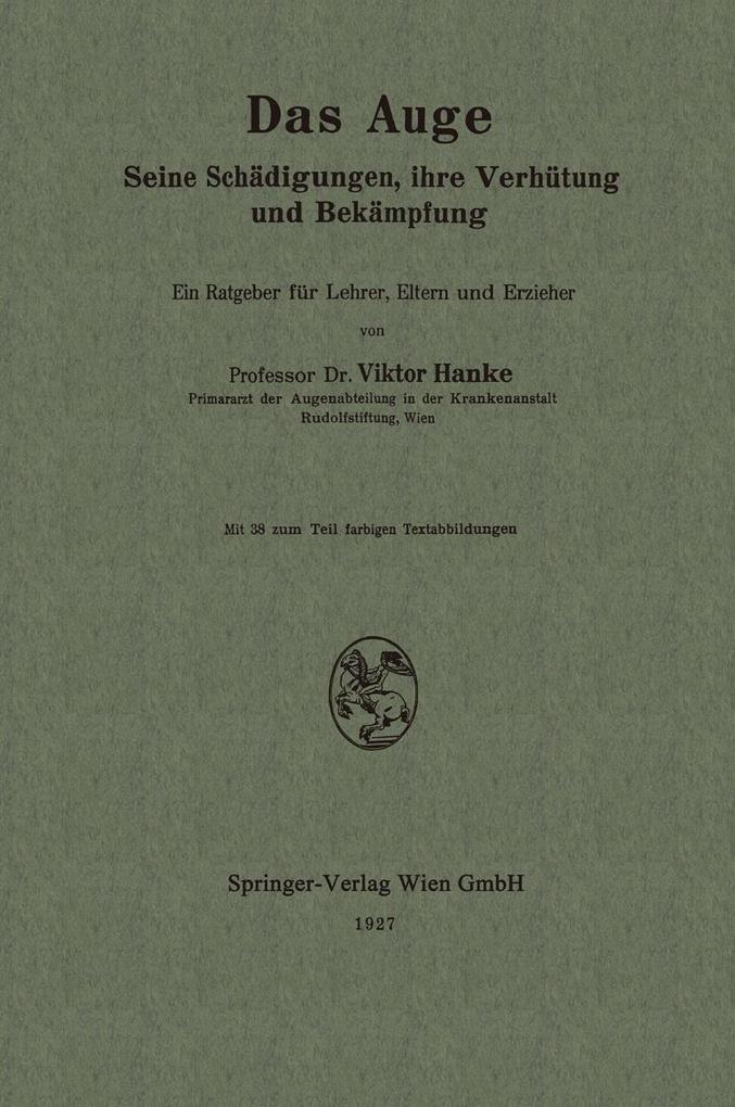 Erster Abschnitt: Anatomie des Auges. - Zweiter Abschnitt: Funktionen des Auges. - Dritter Abschnitt: Erblindung. - Vierter Abschnitt: Maßnahmen zur Verhütung der Erblindung. - Fünfter Abschnitt: Hygiene des Auges. - Sechster Abschnitt: Die Berufswahl. - Siebenter Abschnitt: Die Berufs-(Gewerbe-)Erkrankungen des Auges. - Achter Abschnitt: Schwachsichtigenschulen. - Schlußwort.