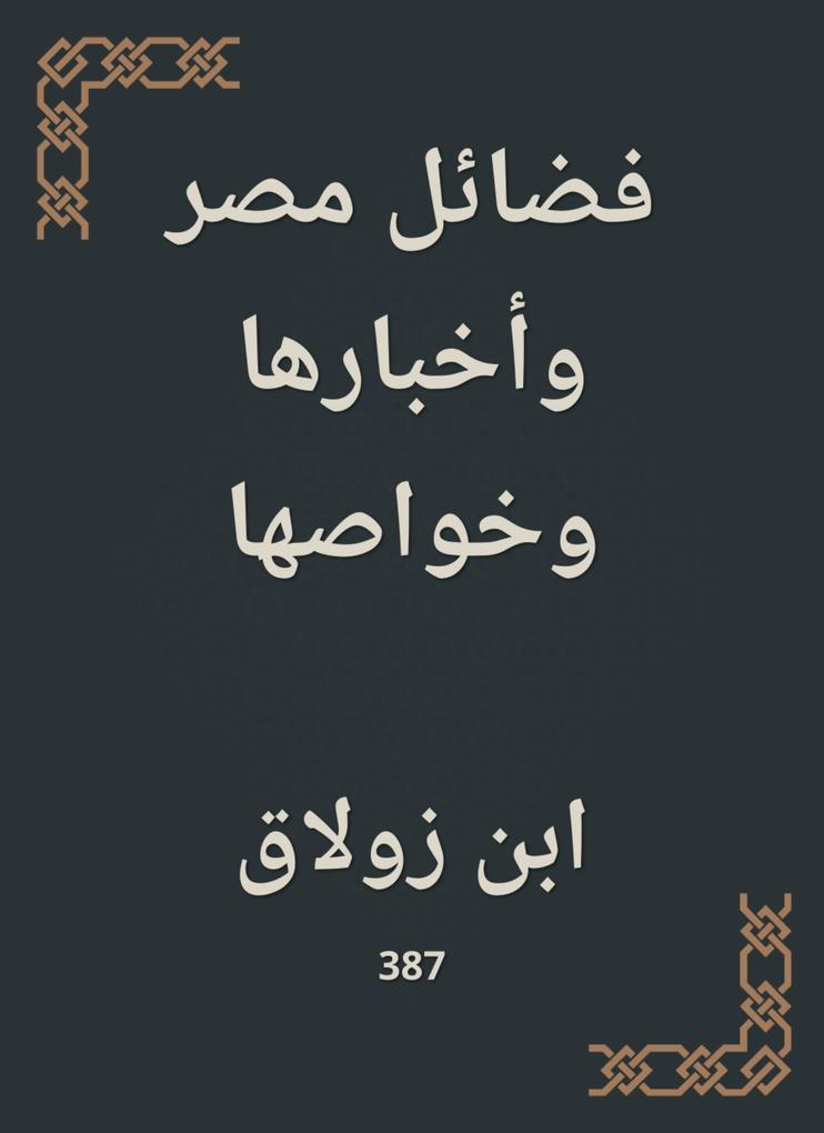 The book deals with a number of virtues; In which Egypt specialized in the places in which Egypt mentioned in the Holy Qur'an, as well as what was narrated from the hadiths on the Holy Prophet on Egypt, as well as the supplication of the prophets, peace be upon them, to Egypt, and who is born in Egypt from the prophets. Among the most important chapters of the book; He separated the mention of the wonders and strangeness of Egypt, in which Ibn Zulk says: The wise men mentioned that the wonders of the world are thirty of which are twenty in Egypt and the ten in the rest of the world, namely: the Damascus Mosque, the Church of Edessa, the Singer Qantara, the Gamdan Palace, a Romanian Church, the olive idol in Sicily, Hajar Al -Awari, Racing, Iwan Kesra in Al -Mudayoun, House of the Wind Balmadir, Al -Ahgar, the three in Baalbek, Al -Khuraq, Al -Sadir, and the Church of Beit Al -Maqdis.