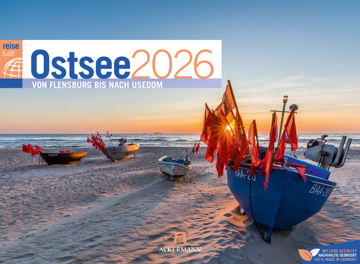 Wie alle Ackermann-Kalender ausschließlich in Deutschland auf Papier gedruckt, das aus vorbildlich bewirtschafteten, FSC®-zertifizierten Wäldern und anderen kontrollierten Quellen stammt. Transparente CO2-Kompensation in Kooperation mit unserem Klimapartner NatureOffice, bei der nachweislich Treibhausgase reduziert sowie die lokale Umwelt und die Belange der Bevölkerung gefördert werden. Auch eine schöne Geschenkidee für Ostsee-Begeisterte, Bewunder:innen von Meer und Küste, Deutschland-Fans und -Tourist:innen.