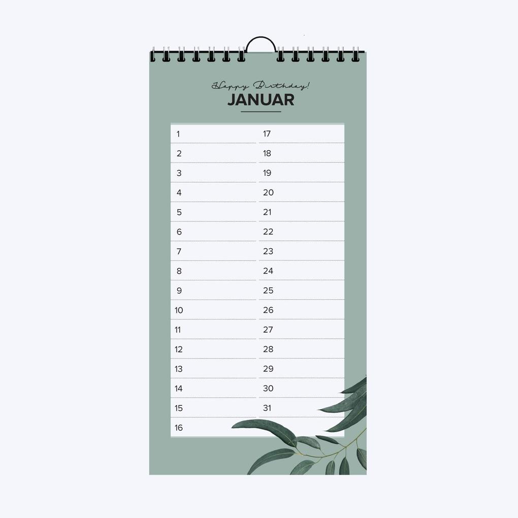 Der Geburtstagskalender ist ein sehr dekorativer Kalender, in dem Sie sich alle Geburtstage übersichtlich notieren können. Ohne Jahreszahl ist er auf kein spezielles Jahr ausgerichtet, sondern alle Jahre wieder