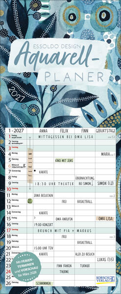 Die edlen Aquarellmotive der Künstlerin Kate von Essoldo Design" machen das Planen zur Lieblingsbeschäftigung! Ob zarte Blüten, stimmungsvolle Meeresmotive oder elegante Herbstblätter - dieser Kalender bringt nicht nur zauberhafte Aquarellkunst perfekt zur Geltung, sondern bietet mit 4 Planungsspalten plus Müllspalte auch genügend Platz, um alles Wichtige im Blick zu behalten.