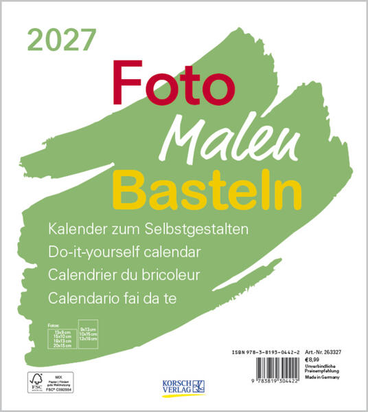 Lassen Sie Ihrer Kreativität freien Lauf und gestalten Sie Ihren persönlichen DIY-Kalender. Mit 12 Kalenderblättern und einem Titelblatt bietet er zahlreiche Möglichkeiten Ihren eigenen Wandkalender individuell zu gestalten.