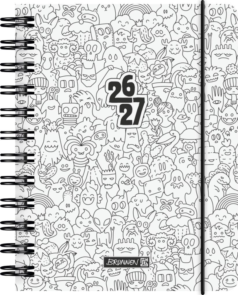 Blattgröße: 120×160 mm; 352 Seiten, Druckfarbe Kalendarium: grau; Wire-O-Bindung; PP-Einband, Softcover, flexibel, abgerundete Ecken, Farbe: weiß, schwarz, Gummizugverschluss; Eckperforation; Monatsplan August 2026 bis Dezember 2027, Ferientermine Deutschland, Österreich, Schweiz, Frankreich, Belgien, Luxemburg, Niederlande und Südtirol, 3 Seiten Notizen, 2 Seiten Stundenpläne und 2 Seiten Notenübersicht; mit Lineal und Sammeltasche; Vorder- . . .