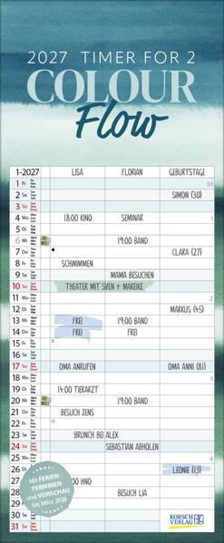 Zarte Aquarellverläufe und kraftvolle Typografie treffen in diesem modernen Timer for 2 aufeinander. Mit 3 Spalten für viel Platz zum Planen, einer übersicht der Ferientermine und einer Vorschau bis März des Folgejahres.