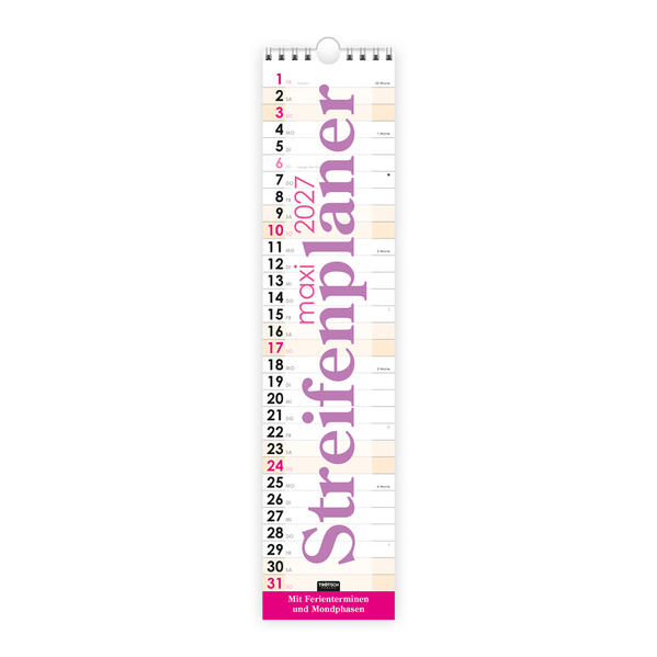 Der übersichtliche Maxi Streifenplaner im schlanken Format von 60 x 14 cm ist ideal für Büro, Homeoffice oder Zuhause. Trotz seiner platzsparenden Größe bietet er ausreichend Platz für Termine, Notizen und persönliche Einträge. Alle gesetzlichen Feiertage, Mondphasen sowie Schulferien sind bereits eingetragen und ermöglichen eine komfortable und vorausschauende Jahresplanung. Das hochwertige Papier sorgt für ein angenehmes, natürliches Schreibgefühl.