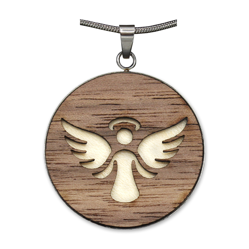 Schutzengel Anhänger mit Edelstahlkette in Geschenkbox mit kleinem Header aus Holz. Durchmesser: 31mm. Feine Kombination aus heimischem Ahorn- und Nussbaumholz, gefasst in Edelstahl!