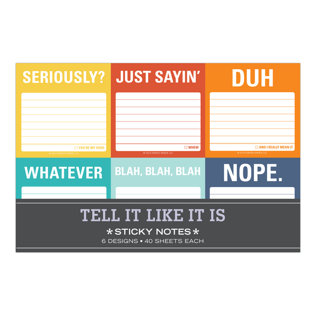 Our Tell It Like It Is Sticky Note Packet combines your love of stickies, fun office supplies, and tidy packages-all in one slick little folio. Armed with a sticky pad for every blasé occasion, you'll find it easy to keep it real (organised). - When you can't say "Duh," your sticky note can! - If 1 sticky pad is great, 6 sticky pads are 8. 5 times as good- 8. 25 x 5. 5 inches; 6 sticky pads; 40 sheets each