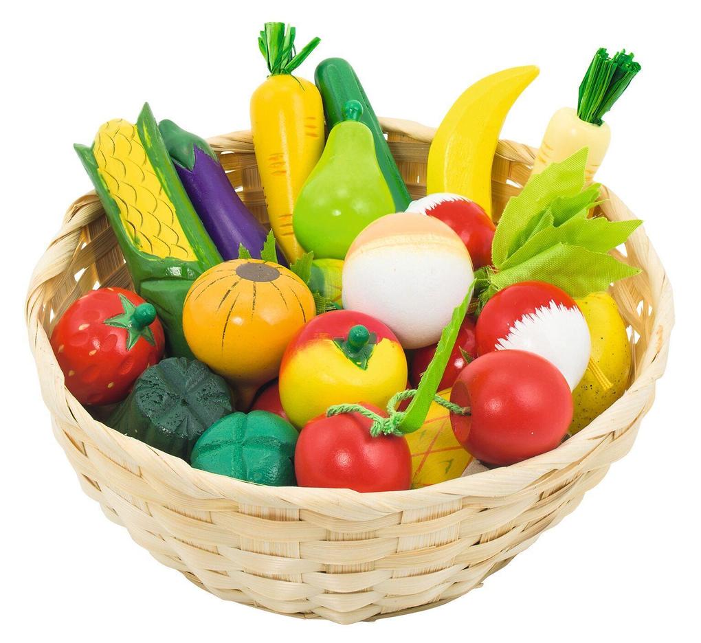 Ein Korb gefüllt mit Obst und Gemüse - die ideale Bestückung für den Marktstand (Art. 51808) oder den Kaufmannsladen (Art. RA201). Ø 21 cm, Fruchtkorb, 22 Teile, per Set. Material: Holz.