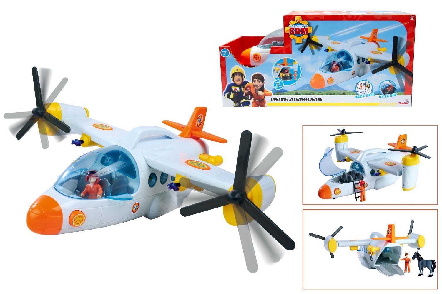 Rettungsflugzeug - das 42cm große Rettungsflugzeug aus Feuerwehrmann Sam besitzt einen Griff zum Tragen sowie Rollen zum perfekten Landen. Die zwei Rotoren auf der Seite lassen sich drehen.