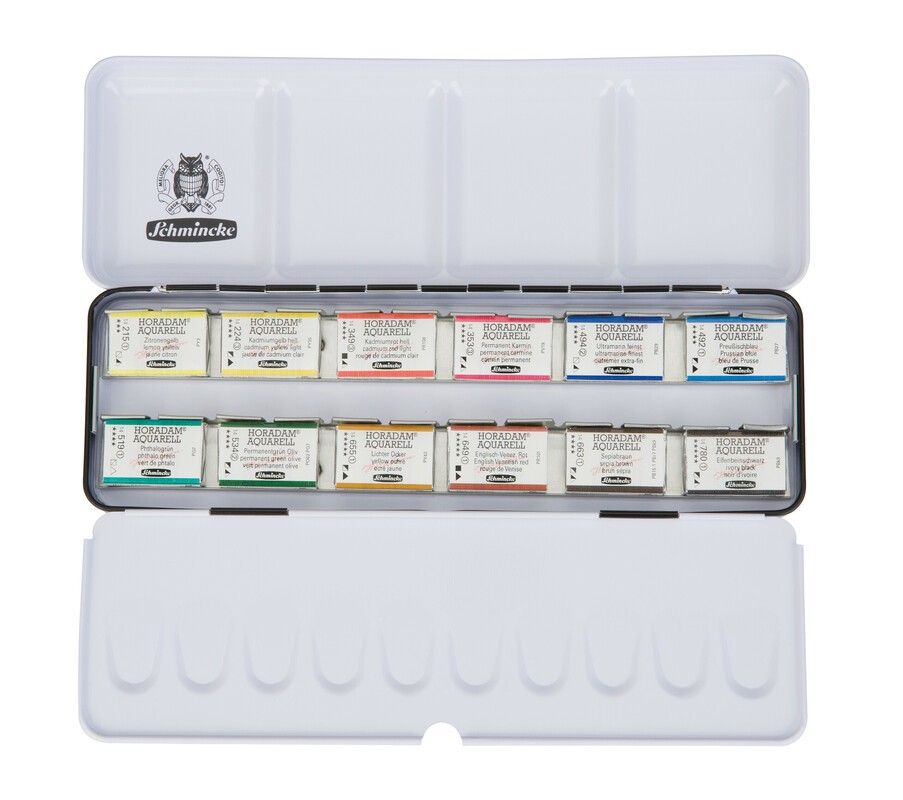 Der HORADAM Einstiegskasten von Schmincke besteht aus einem stabilen Metallkasten (L x B x H: 22, 3 x 7, 2 x 2, 3 cm) mit 12 coloristisch ausgewählten Farben sowie einer integrierten Mischpalette. Die Farben im Kasten befinden sich in ganzen Näpfchen. Mit der ausgewogenen Farbauswahl lassen sich viele weitere brillante Farben leicht mischen.