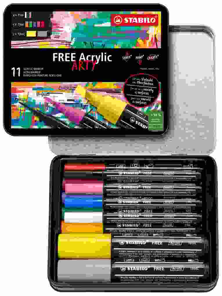 Mit der STABILO FREE Acrylic Marker-Range nahezu grenzenlos gestalten und individualisieren. Marker mit drei sorgsam ausgewählten Spitzenvarianten und bis zu 20 deckenden Farben stehen zur Auswahl. Oberflächen können mit der deckenden und lichtechten pigmentierten Abrylfarbe flexibel designt und gestaltet werden, von Papier über Stein bis zu Keramik, Kunstleder und Holz.