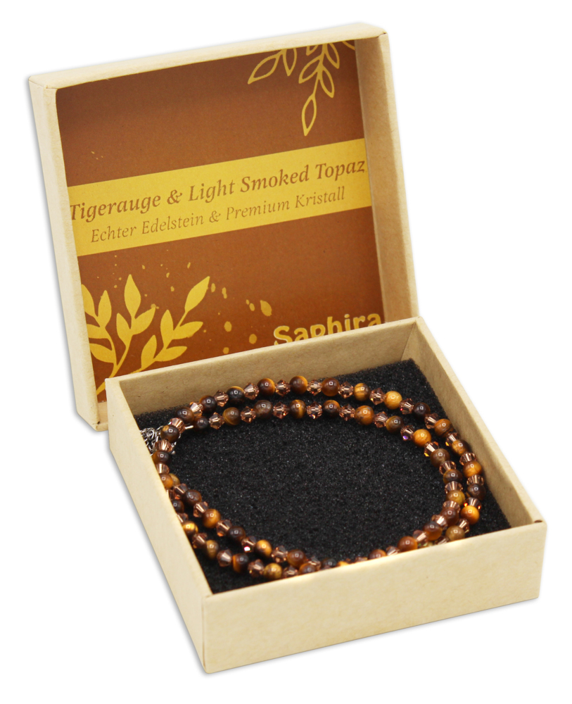 Tigerauge Saphira Edelsteinkette, jeweils in hochwertiger Geschenkbox mit farblich abgestimmtem Inlay. Länge: ca. 41, 5 +5cm (verstellbar). Die Saphira Schmuck Kollektion verbindet echte Edelsteine mit funkelnden Premium Kristallen. Jedes Schmuckstück ein glitzerndes Unikat in edleer Geschenkverpackung.