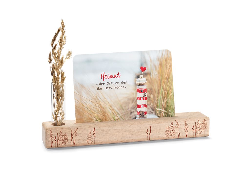 Dieser edle Halter mit einem Schlitz zum Aufstellen von Karten und einer Vase für eine passende Blume passt hervorragend auf jeden Schreibtisch und in jedes Regal. Kombinieren Sie eine Karte mit ermutigendem Spruch oder schönem Design mit einer schönen Blume oder einem hübschen Zweig aus dem Garten. Stellen Sie geschenkte Karten gut sichtbar auf anstatt sie in einer Schublade verschwinden zu lassen. Der Halter eignet sich auch hervorragend als Geschenk - schon mit einer Karte und einer Blume befüllt.