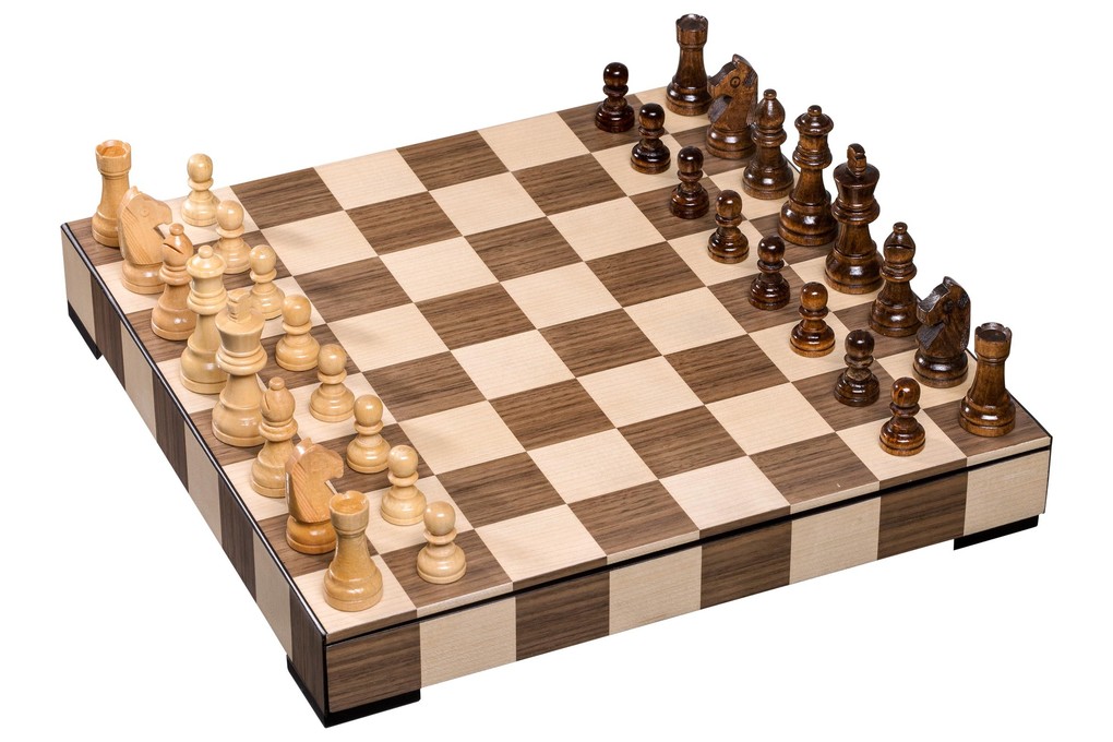 Kassette: MDF und Furnier, 1 Schubfach für die Schachfiguren, magnetisch. Masse: 360 × 360 × 57 mm, Feldgrösse 45 mm. Figuren: Erle, Natur und braun gebeizt, Filzsockel, Königshöhe 76 mm. Spielfeld: Walnuss und Ahorn, Intarsien.