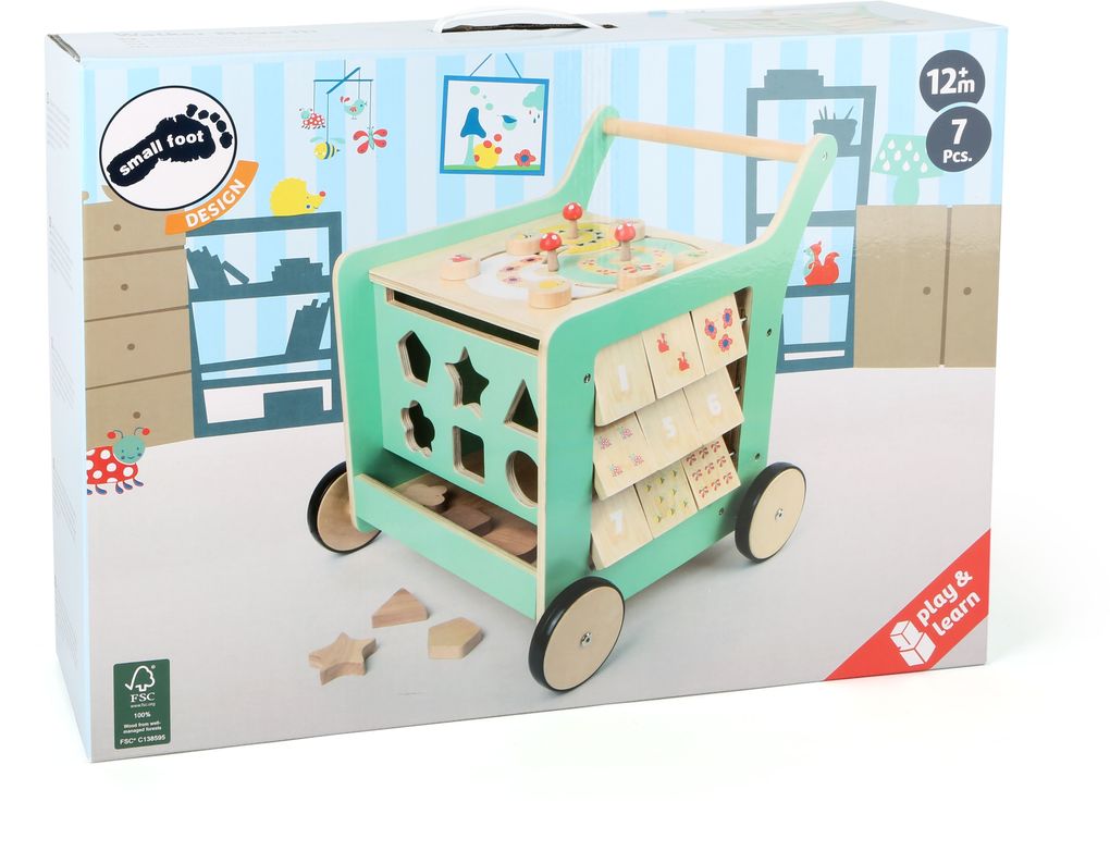 Dieser Lauflernwagen aus FSC 100%-zertifiziertem Holz ist ein echtes Multitalent in seiner Funktion und überzeugt mit reduziertem Design. Hier kann gedreht, gesteckt und sogar gemalt werden. Die obere Platte lässt sich ganz einfach hochklappen und bietet im Inneren genügend Stauraum für weitere Spielsachen. Durch die Feststellbremse kann beim Laufenlernen nichts passieren. Mit durchgängiger Achse. Bitte beachten Sie, dass dieser Artikel vorher die Artikelnummer 10455 hatte.
