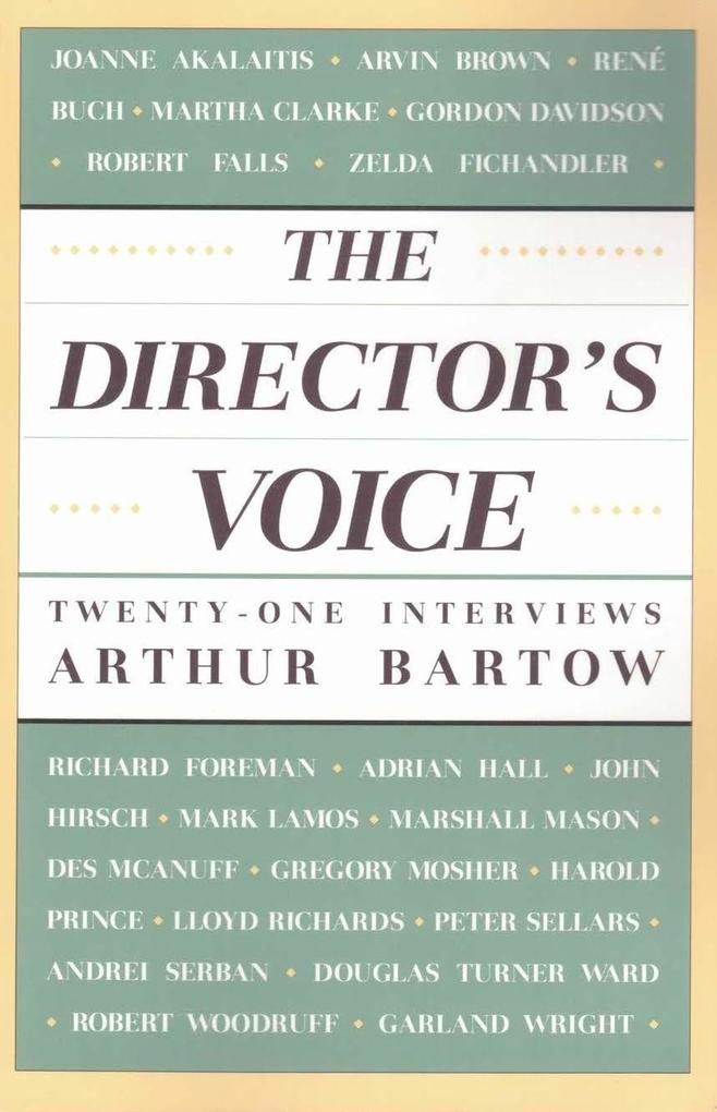Foremost stage directors describe their working process: JoAnne Akalaitis, Arvin Brown, René Buch, Martha Clarke, Gordon Davidson, Robert Falls, Zelda Fichandler, Richard Foreman, Adrian Hall, John Hirsch, Mark Lamos, Marshall W. Mason, Des McAnuff, Gregory Mosher, Harold S. Prince, Lloyd Richards, Peter Sellars, Andrei Serban, Douglas Turner Ward, Robert Woodruff, and Garland Wright.