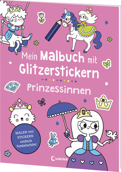 Hereinspaziert in die märchenhafte Welt der Prinzessinnen! Male die Bilder aus und verziere sie mit traumhaft schönen Glitzerstickern. Achte dabei auf die grauen Felder! Sie zeigen dir den richtigen Platz für die Aufkleber.